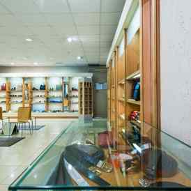 Залы магазинов светлые, что создает ощущение простора. Золотистые гербы, фирменная вывеска с орнаментом из веточек дуба и стеклянные витражи с логотипом в стеллажах делают атмосферу внутри салона теплой и уютной.